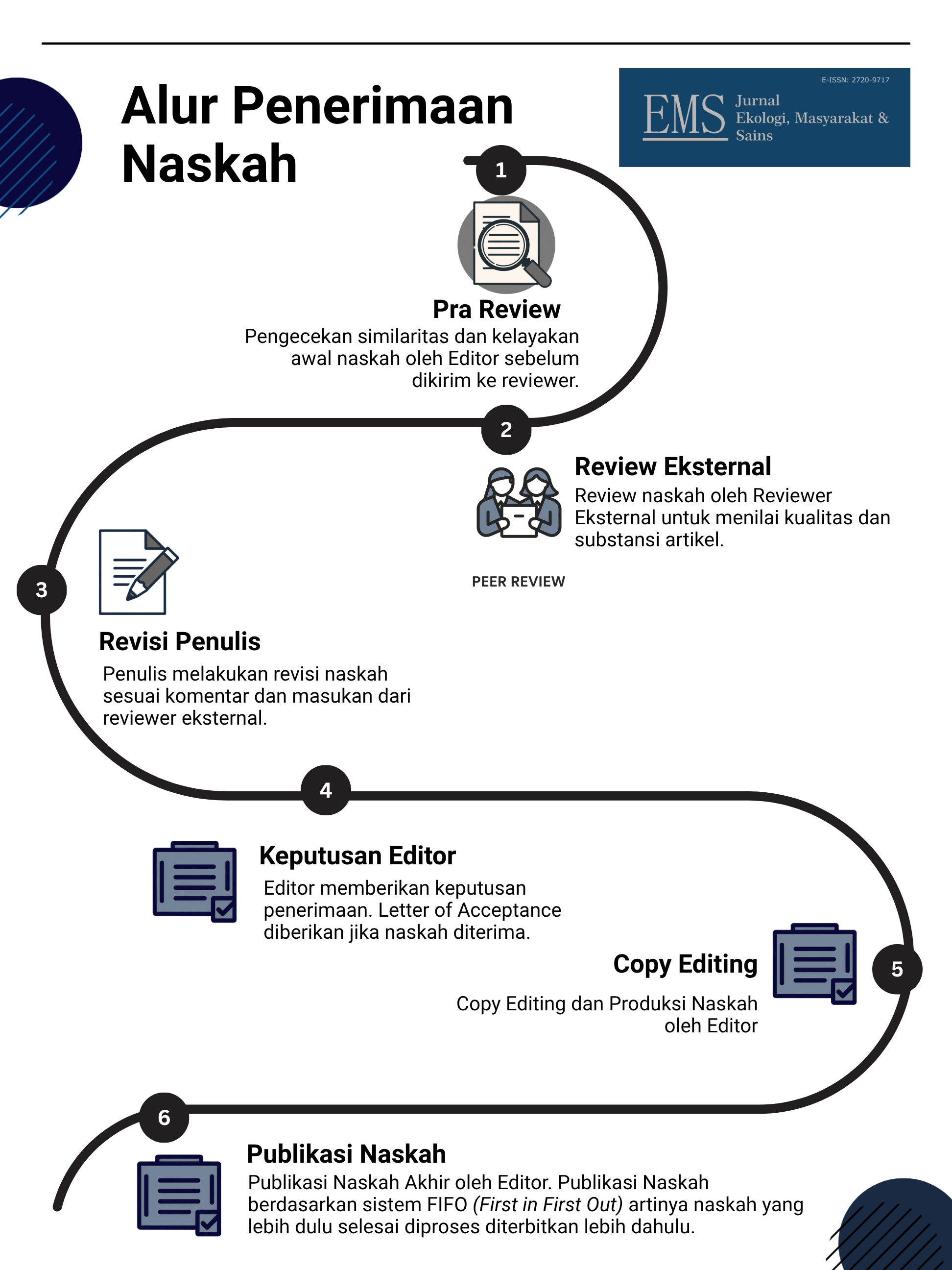 Jurnal Ekologi, Masyarakat dan Sains (EMS) menerima naskah sepanjang tahun. Naskah yang dipublikasikan melalui proses berikut: